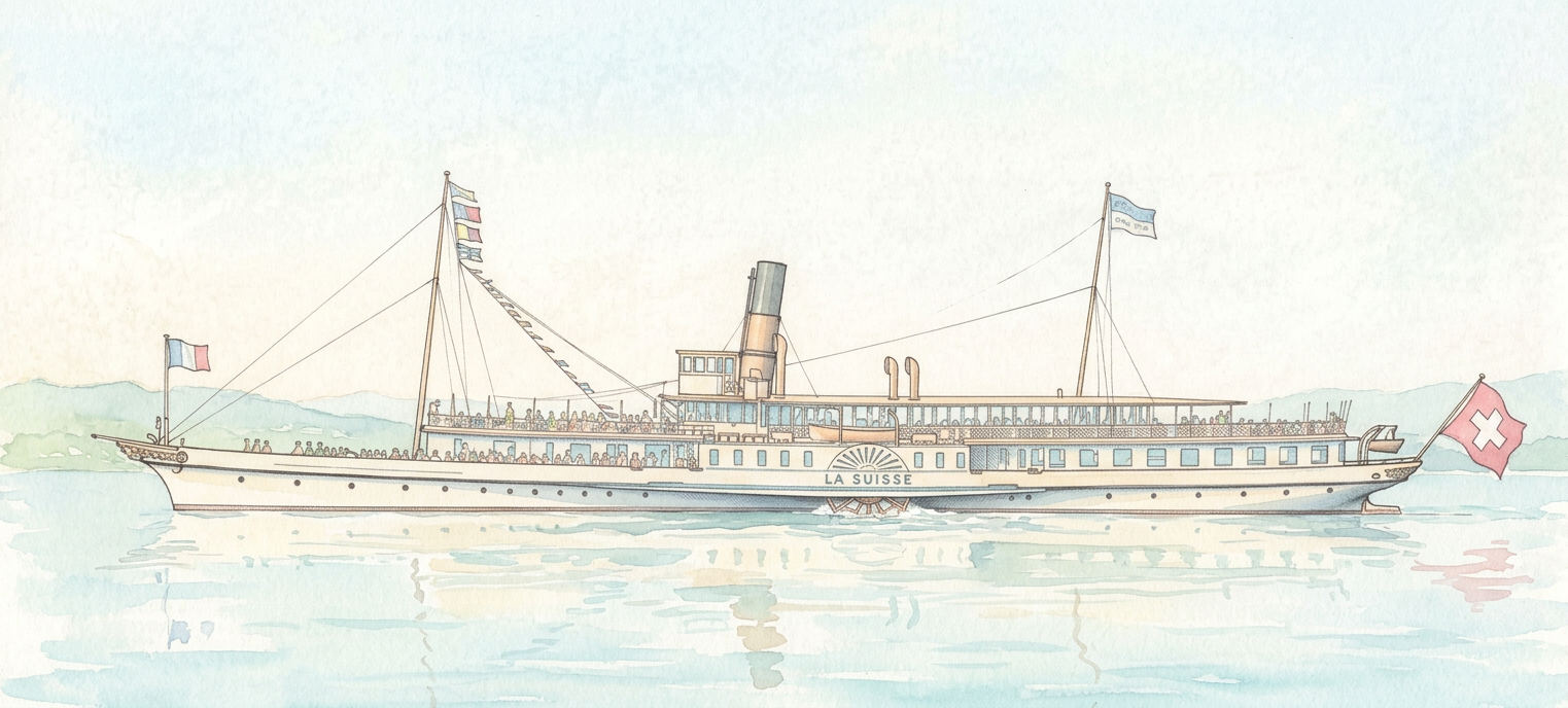 La Suisse est un emblématique bateau à vapeur de la Compagnie générale de navigation sur le lac Léman (CGN), construit dans le style Belle Époque et reconnaissable à ses roues à aubes[1, 5, 6]. Mis en service en 1910, il mesure 78,5 mètres de long et affiche une puissance de 1 400 chevaux (1 030 kW), ce qui en fait l’un des plus imposants de la flotte[2, 6]. Avec une capacité de 850 passagers, il peut également accueillir jusqu’à 200 personnes dans son restaurant, offrant une expérience à la fois majestueuse et conviviale www.cgn.ch .Ce bateau incarne le charme intemporel de l’Art Nouveau, s’intégrant parfaitement au paysage du Léman et aux escapades entre la France et la Suisse www.myswitzerland.com . Il est souvent utilisé pour des croisères panoramiques, permettant de découvrir des sites emblématiques comme le Château de Chillon ou les terrasses de Lavaux, classées à l’UNESCO www.lausanne-tourisme.ch .À noter : En 2025, La Suisse a temporairement été immobilisé en raison d’une fissure sur un support de cylindre haute pression, mais il reste un pilier du patrimoine maritime lémanique www.rts.ch .